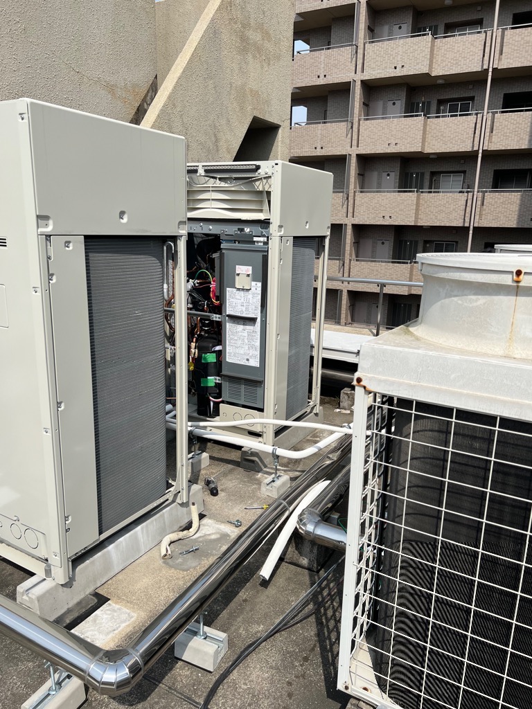 写真の手前新しい室外機の奥の室外機の更新でレッカーが届かない様です